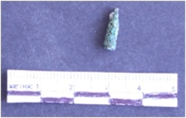 | Description / विवरण | It is a corroded copper piece, pointed at one end and broken from the other side. Circular in section, greenish brown in color. |