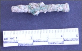 | Description / विवरण | It is an elongtated copper piece, tubular in shape, pently bulged up from the centre. The fragment is completely corroded with impurities emboded with some soil greenish in color. |