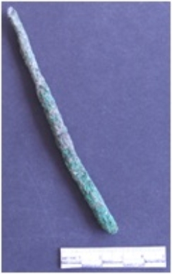| Description / विवरण | It is a copper rod, broken into two pieces, joined together with adhesive, completely corroded and emboded with soil particles, greenish in color. |