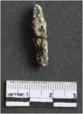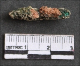 | Description / विवरण | It is a corroded copper rod fragment. It is greenish brown in color. Some soil particles are embedded on them. |