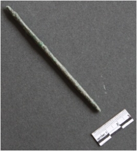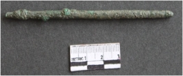 | Description / विवरण | It is a corroded copper pin elongated in shape. Tubular in shape with rounded edges. Greenish in color. |