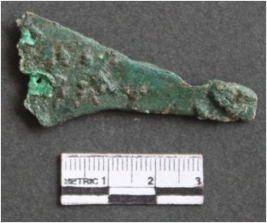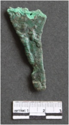 | Description / विवरण | It is a corroded copper ladle fragment. The scooped portion is broken. It is just the handle of the ladle. Greenish brown in color. One side it is broad and flat whereas in other end. It is narrow with rounded edges. |