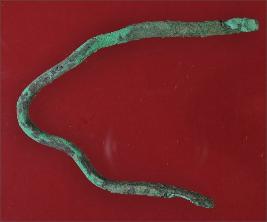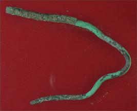 | Description / विवरण | Trench WG 4, Qdt 2, layer 7 It s a copper object. It is unusually curved without any shape. Both ends are flat and sharp with deposition of hard patina. |