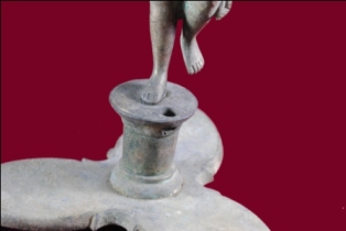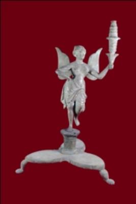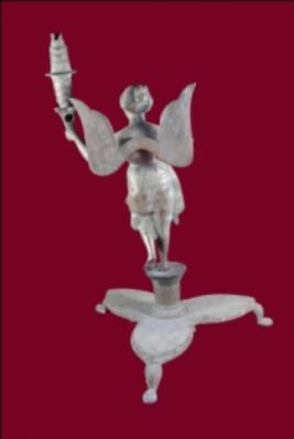 It s an angle with lamp made by metal. Well decorated and used for religious purpose. Features are clearly visible and lamp is damaged. Deposition of dust and patina