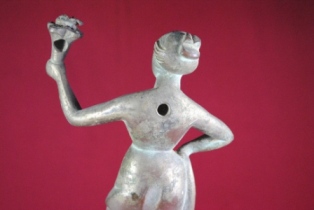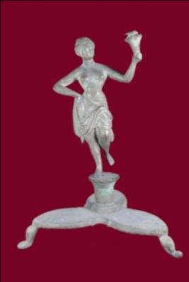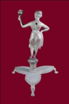 It s a lady with lamp or baton made by metal. Well decorated and used for religious purpose. Features are clearly visible and lamp is damaged. Deposition of dust and patina.
