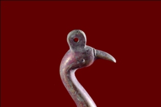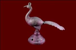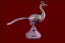 It s a peacock made by metal. Well decorated and a hole on head with face. Colour is red. Deposition of dust and patina.