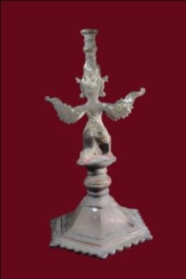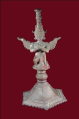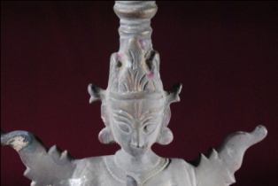 It s an apsra sculpture made by metal. Wearing a crown and hands are prayer position. Bottom portion is flat. Deposition of dust and patina.