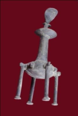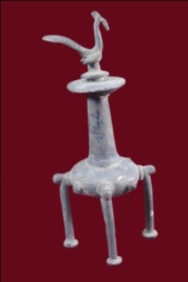 It s a show piece made by metal. A decorated peacock in upper portion and bottom portion are four legs. Deposition of dust and patina
