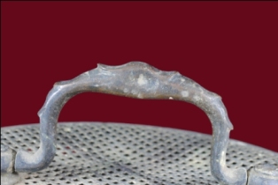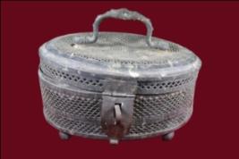 It s a box made by metal. Well decorated and a handle on it. Bottom portion is flat with four legs. Deposition of dust and patina.
