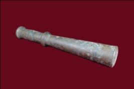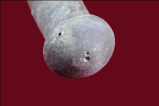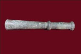 It s a grinder rod made by metal. Bottom portion is flat and a knob on it. Deposition of dust and patina.