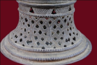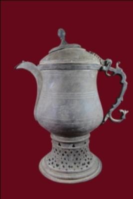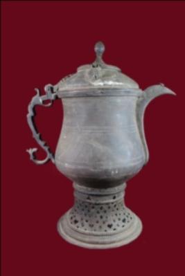 It s a jug made by metal. Its may be used for dringing purpose. Well decorated and a handle, cap, pippet on it. Bottom portion is flat. Deposition of dust and patina.