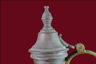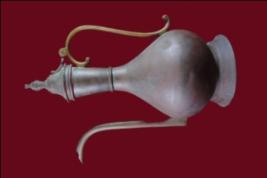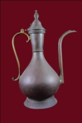 It s a jug made by metal. Its may be used for dringing purpose. Well decorated and a handle, cap, pippet on it. Bottom portion is flat. Deposition of dust and patina.