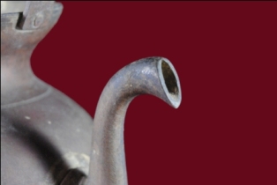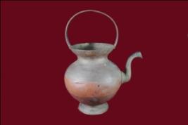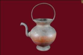 It s a kamandal made by metal. Well decorated and a handle on it. Bottom portion is flat and a hole on it. Deposition of dust and patina.