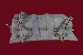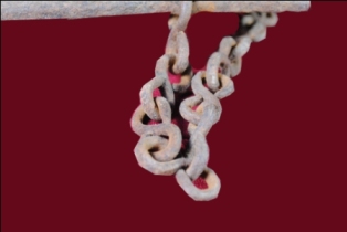 It s a lock made by iron. Some portion is damaged a chain on it. Deposition of dust and patina.