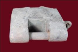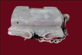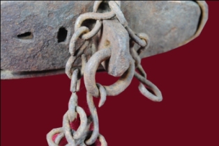 It s a lock made by iron. Some portion is damaged a chain on it. Deposition of dust and patina.