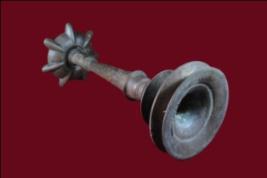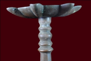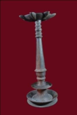 It s a lamp diya made by metal. Well decorated and used for religious purpose. Seven knobs in upper portion and bottom portion is flat. Deposition of dust and patina.
