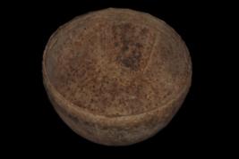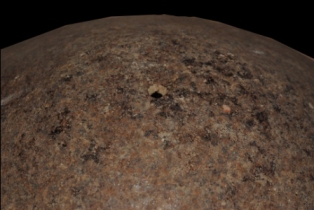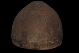 It s a drum made by iron. Colour is brownish. Its outer surface is rough and many cut marks, a hole on it. Rubbing on surface and deposition of hard patina, dust.