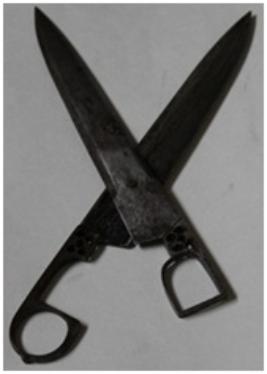 | Description / विवरण | This is a steel scissor, with hollowed ground blades and finely pierced handles. Its blades are shaped like daggers. These types of scissors are a part of kalamdan, and are used to cut paper rolls to the needed size. |