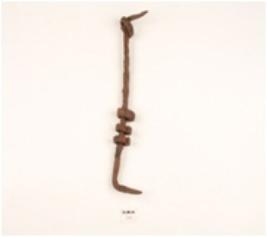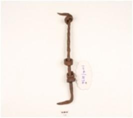 | Description / विवरण | A clamp made on iron with four rings, pointed and curved end, chemically treated rusted surface. |