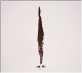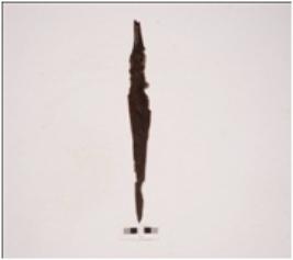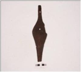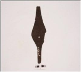 | Description / विवरण | Fragment of a copper arrow-head with flat broad body, missing pointed top, intact shaft, two circular perforation one body and other on shaft. |