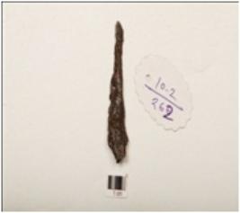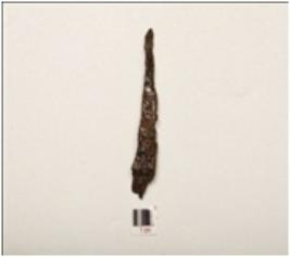 | Description / विवरण | An iron clamp, pointed one end another broad, polished and chemically treated and rough surface. |
