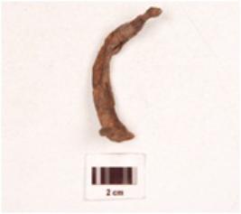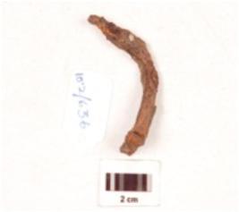| Description / विवरण | A nail made iron, pointed one end, broad flat other end projected outward, bended body, rusted surface. |