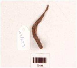 | Description / विवरण | A nail made of iron, pointed at one end, flat broad other end projected out ward, rectangular in section, bended body, rusted surface. |
