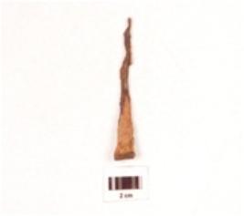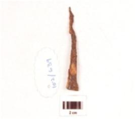| Description / विवरण | Fragment of a nail made of iron, pointed one end, broad other end projected out ward, rectangular in section, rusted surface. |