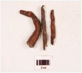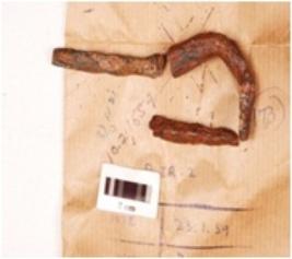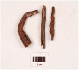 | Description / विवरण | Fragments of an iron nail, broken into three pieces, one piece is curved with broad end and pointed tip, rectangular in section mended. |