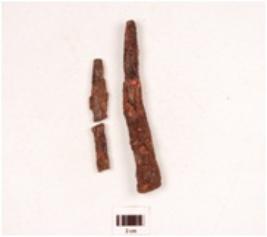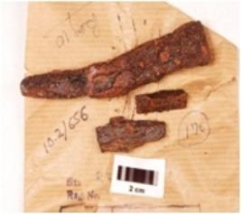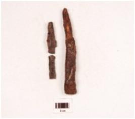 | Description / विवरण | An iron nail, slightly curved and mick surface, pointed and tapering end, broken into fragments and mended. |