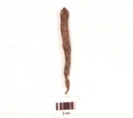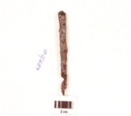 | Description / विवरण | A iron nail, uneven in shape, rusted head is missing, irregular edges. |