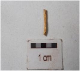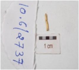 | Description / विवरण | A small fragment of gold thin wire, wavy, pointed end and elongated surface. |