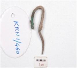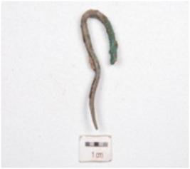 | Description / विवरण | Fragment of a copper hook, rectangular cross-section and green incrustation on surface. |