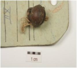 | Description / विवरण | A copper bell, loop intact, hollow interior and round in shape. |