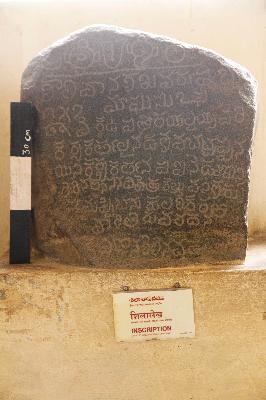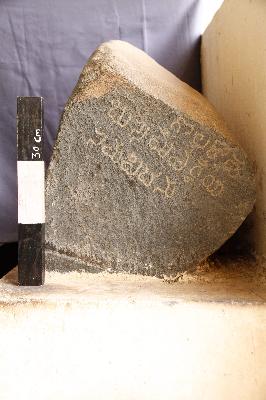 | Description / विवरण | A boulder with an early Telugu-Kannada inscription. The top of the inscription has depictions of a crescent, chakra, urdhva pundra, conch and sun. It has nine lines on the front side and three lines on the right side. The inscription belongs to Venkatapatideva Maharaya of the Aravidu Dynasty. |