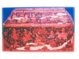 | Description / विवरण | It is a decortaed wooden box. Different lype of miniatures are shown at the top and bottom and it is red in colour |