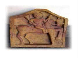| Description / विवरण | It is a sculpture of a memory pillar. Horse rider is depicted in a racing posture. Man is taking bridal in left arm and spear like equipment in right arm |