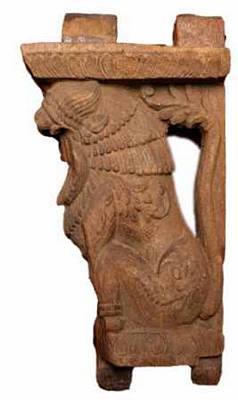 | Description / विवरण | A bracket figure shows a seated Kesari lion on its hind legs and raised with its fore legs. It is shown with wide open mouth and hanging tongue, bulged protruded eye balls, ear lobes, three tiered trimmed hair locks on its neck collar, hanging mane below the neck, genitals. The raised curved tail of the animal rested on the back of its neck. The tail end is shown with creeper like design. |