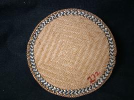 | Description / विवरण | It is a circular mat woven by using thin flat bamboo strips. It is used as a glass cover. On the back side bold strips are used. It has two borders. |