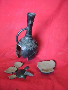 | Description / विवरण | It is a surahi with handle. It has long neck having incised geometrical design. |