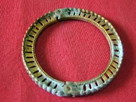 | Description / विवरण | It is a bracelet having holed design of vertical, thick pillar with some oblique circle and its outer part is raised with two ball designs. |