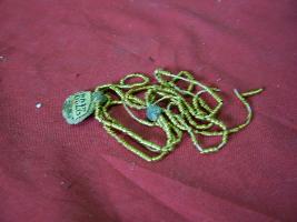 | Description / विवरण | This is a lace ornament having three strings of miniature golden beads and its middle part has amulets and one clay bead. |
