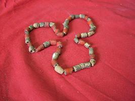 | Description / विवरण | This is a clay ornament with cylindrical shape beads. It has red and brownish beads on the string. |