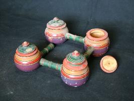 | Description / विवरण | Four wooden pots with covers in globular shape. It is enamelled. It is also known as hatri or chomak. |