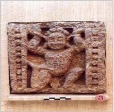 | Description / विवरण | The Sculptural fragment within the beaded borders depicts a squatting atlantid gana with his upraised hands in a supporting pose. |