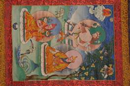 | Description / विवरण | Characterised of a two tier floral mount, the painting is dominated by three icons. Tsongkhapa 1347-1419 . He is portrayed in the teaching gesture and carrying his symbols, books and sword, on lotus flowers. |