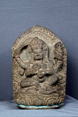 | Description / विवरण | Seated figure of either the Buddhist deity Hayagriva or Bhairava , a frightful aspect of Siva in which he frightens Parvati with a snake. |