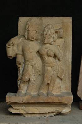 | Description / विवरण | Fragment of a temple wall showing the standing figures of Uma-Mahesvara. Siva touches the breast of Parvati with one of his hands. Rest of the hands of both figures are lost. Coarse workmanship. |