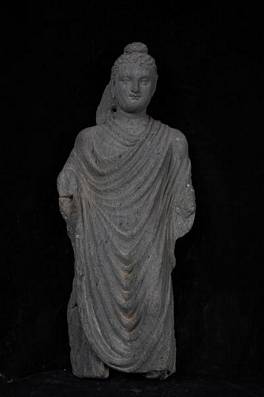 | Description / विवरण | The lower legs, the arms, and most of the halo are missing.The right knee is bent, giving the figure a gently swaying movement. The face is full, round, and softly modeled with large eyes and thin lips. The hair is done in wavy strands and covers both the head and the usnisa which is encircled by a plain fillet. The robe falls in three heavy folds at the neck and is draped over the left shoulder. |