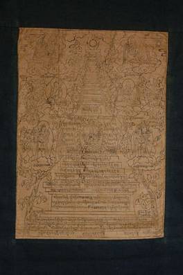 | Description / विवरण | Mounted on a black cloth, this incomplete painting is a woodblock print of Tsong-khapa 1347-1419 , the Precious Lord of the Teachings. He is portrayed in the teaching gesture, carrying his symbols, book and sword on lotus flowers. |